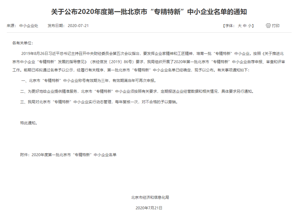 2019年8月26日習近平總書記主持召開中央財經委員會第五次會議指出,要發揮企業家精神和工匠精神,培育一批“專精特新”中小企業。根據《關于推進北京市中小企業“專精特新”發展的指導意見》要求,北京市 “專精特新”企業是指具備“專業化、精細化、特色化、新穎化”特征的工業中小企業。