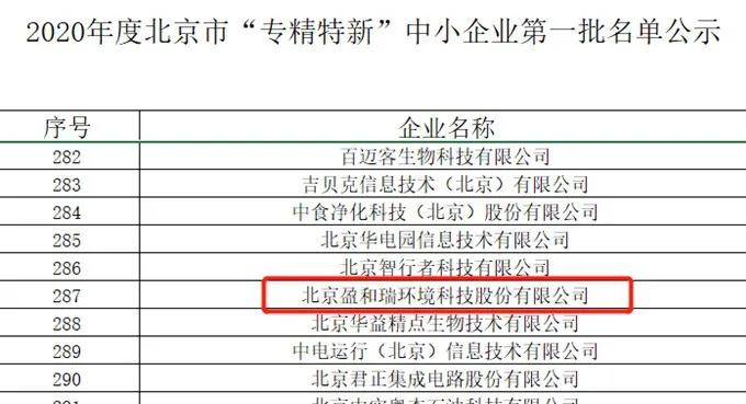 近期,由北京市經濟和信息化委員會和北京市財政局搭建的北京市中小企業公共服務平臺,公布了2020年北京市“專精特新”中小企業名單。公示名單顯示,北京盈和瑞環境科技有限公司入選。